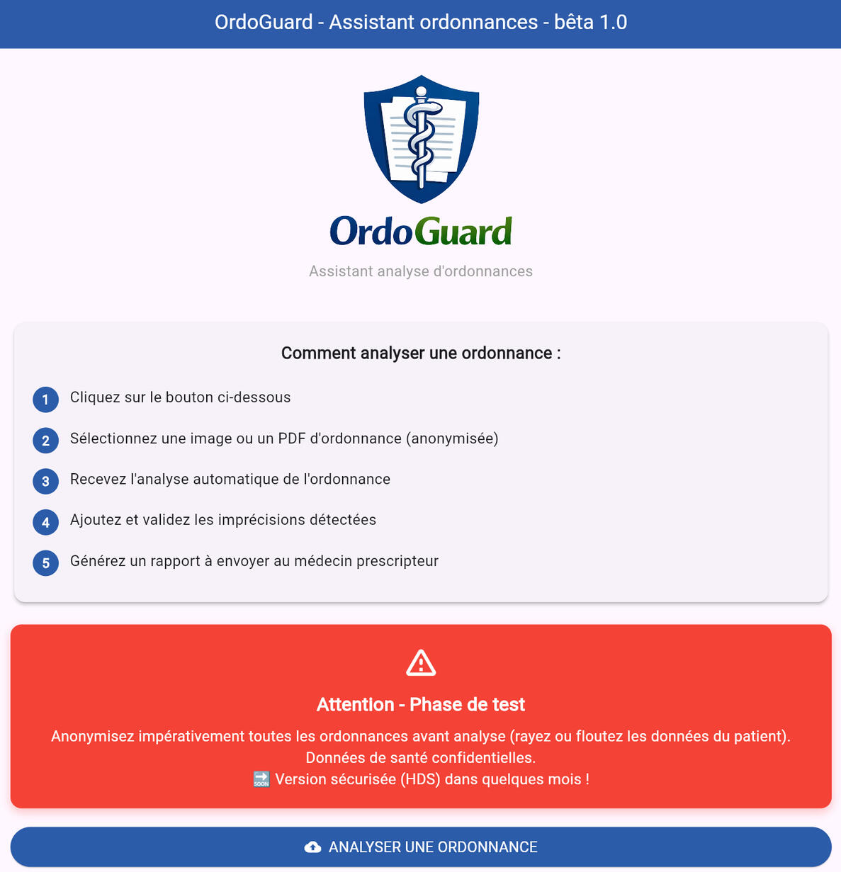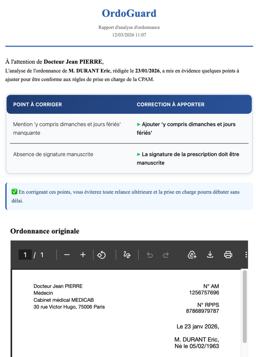 OrdoGuard analyse automatiquement les ordonnances, détecte les erreurs et génère un rapport de correction à envoyer prescripteur