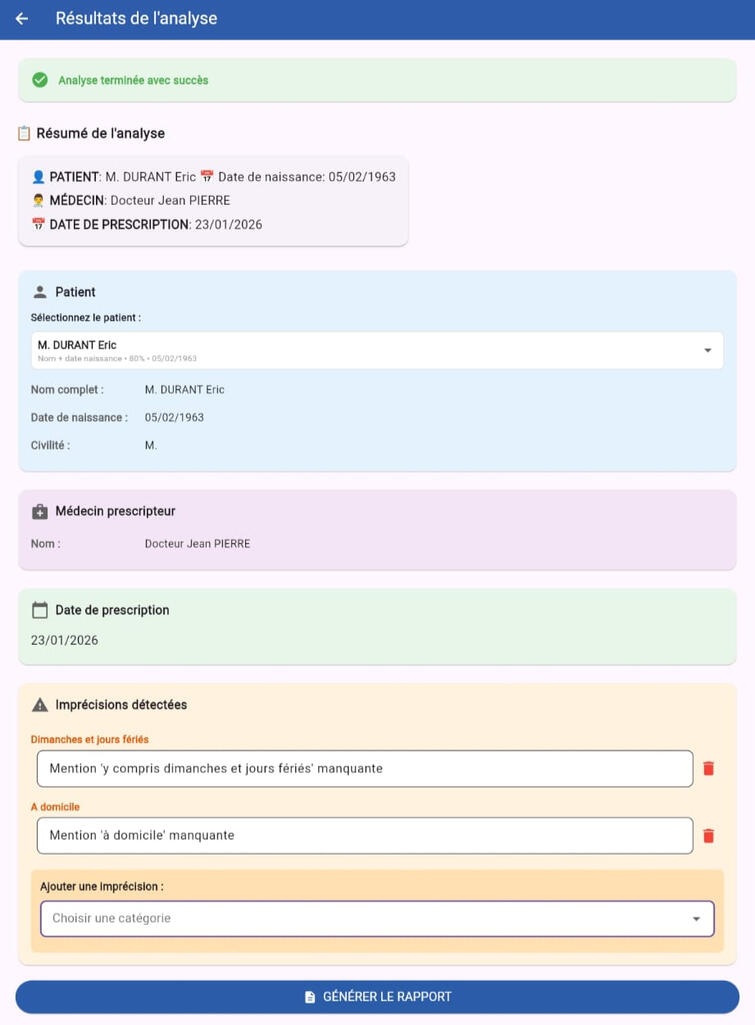 OrdoGuard analyse automatiquement les ordonnances, détecte les erreurs et génère un rapport de correction à envoyer prescripteur